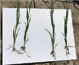 Figure 5. July 9, 2019 – root comparison of inoculated oats (right) versus non-inoculated roots (left).