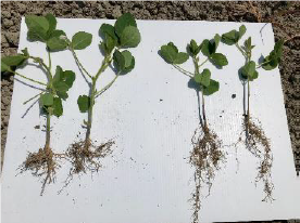 Figure 7. July 9, 2019 – root comparison of inoculated soybeans (right) versus non-inoculated roots (left).