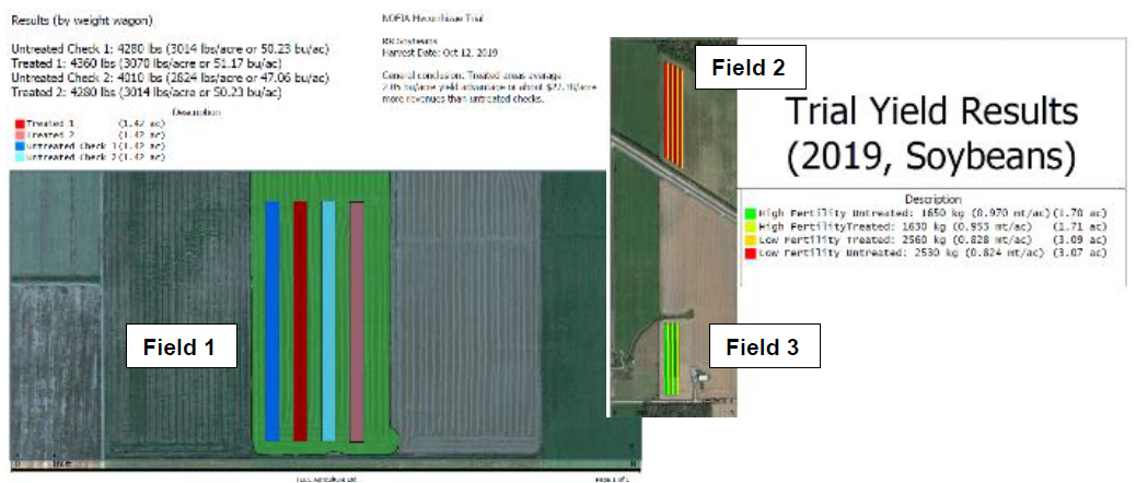 There were three plots of soybeans this year: two planted into lower fertility ground (based on what the farmer knew of their fields) and one into higher fertility ground. The low fertility plots had lower phosphorus and potassium. The higher fertility plot had higher potassium and more organic matter. Results from these plots showed a more apparent difference in treated vs. untreated in the lower fertility plots compared to the higher fertility plots. A site visit on July 9, 2019 showed slightly more root development in the soybeans treated with the inoculant (see figure 7).