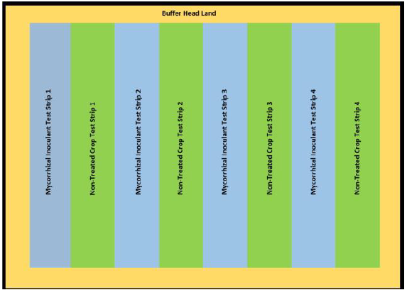 Figure 1: Trial plot set-up. At least four reps of inoculated and non-inoculated strips were planted at each plot site over a 5-acre area.