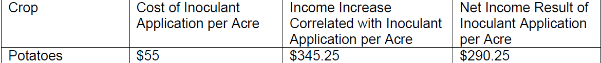 The first year of this trial yielded promising results that suggested the mycorrhizal inoculant increased yield enough not just to cover the cost of application, but also to significantly increase the income from potatoes per acre.