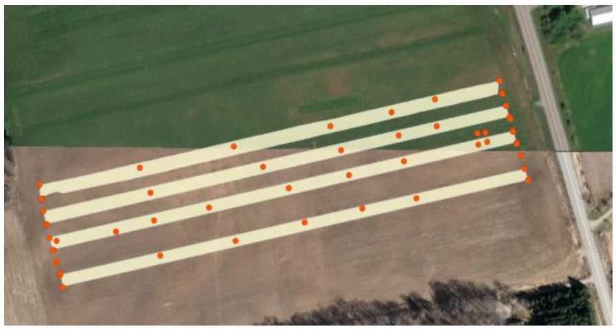 Figure 1. Plot set-up at the Brantford 2018 site. Each strip was marked and all samples and counts were taken from the same five geo-referenced locations (red dots) along the length of each strip throughout the season.
