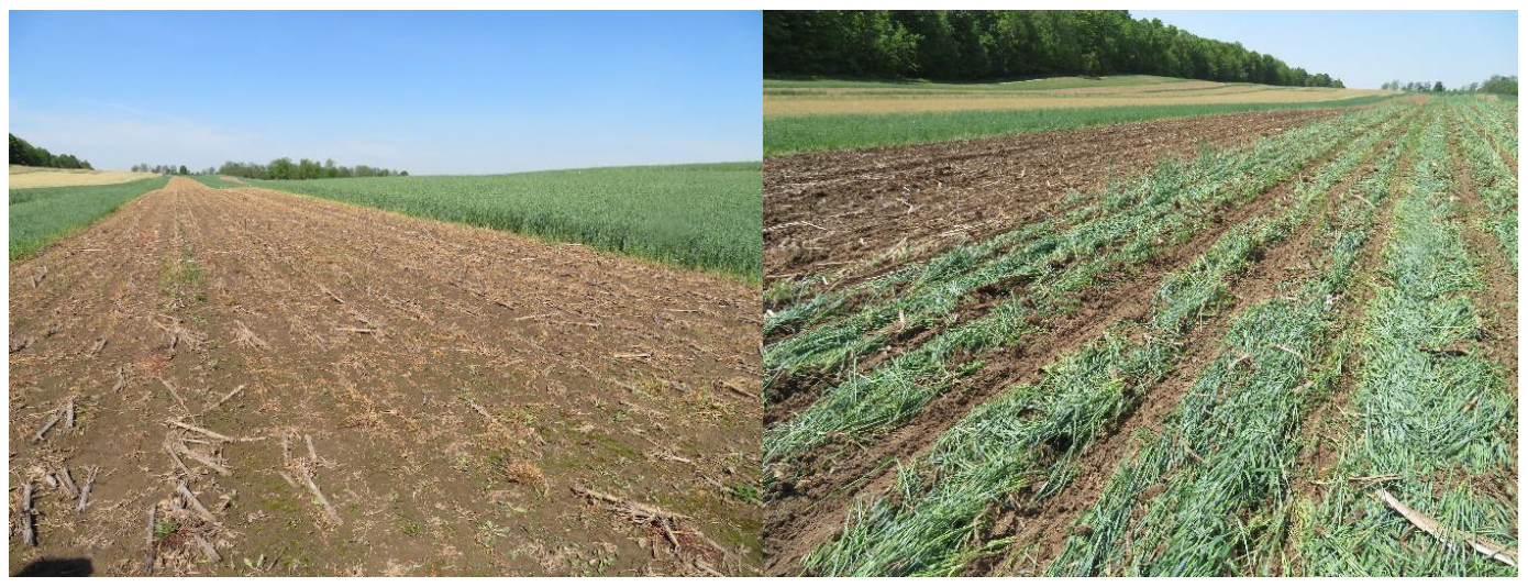 Figure 2. Early vs. late-terminated rye strips at the Brantford 2018 site before (left) and after (right) planting. May 25, 2018.