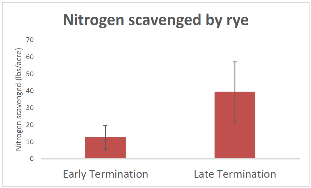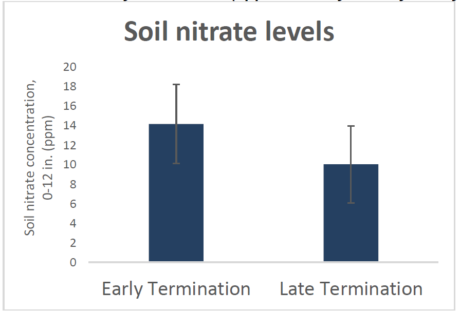 The early termination of rye resulted in slightly higher soil nitrate levels at the time of planting. Soil nitrate concentration was more than 4 parts per million lower in late-terminated strips (10.0 ppm vs. 14.2 ppm; Figure 3).