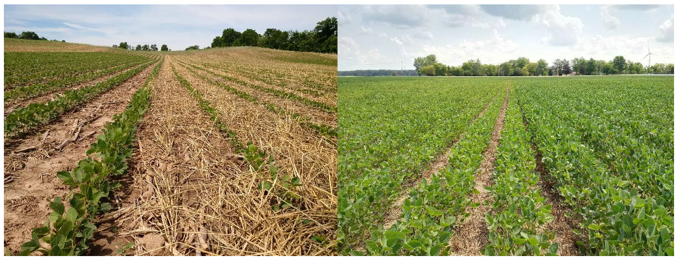 Figure 5. Soybeans at the Brantford 2018 site on June 26 (left). Soybeans planted green into rye were one growth stage behind and shorter than those planted into early terminated rye. At the Lambton 2018 site on July 31 (right), soybeans planted into early terminated rye (right-hand side of photo) were taller and one growth stage ahead.