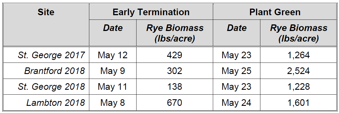 Across four sites, rye biomass increased on average by 4.3-times when terminated at time of soybean planting compared to ~2 weeks prior (Table 3).