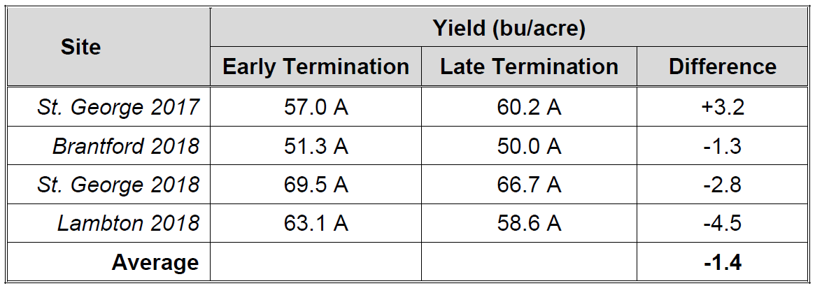 Table 6. Summarized yield results from all sites. Statistically significant differences in yield between early vs. late termination at each site are shown by different letters. Yield is based on 13% moisture.