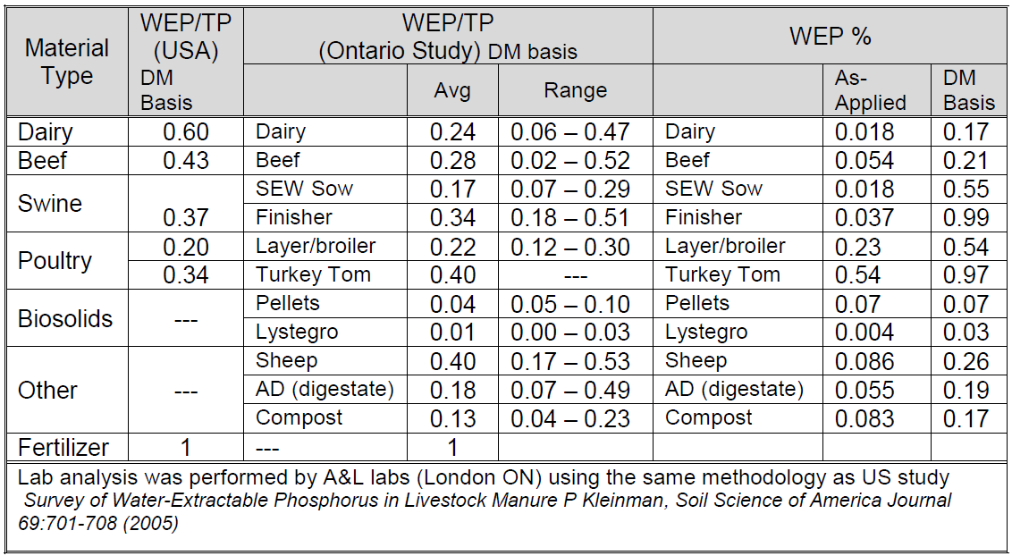 Water extractable phosphorus (WEP) in manure has been linked to dissolved P in runoff from organic amendment/manure-amended soils. A 2001 study (Withers et. al.) found that concentrations of dissolved P in runoff from soils amended with mineral fertilizer, cattle manure and biosolids were proportional to the concentration of WEP in the different amendments.