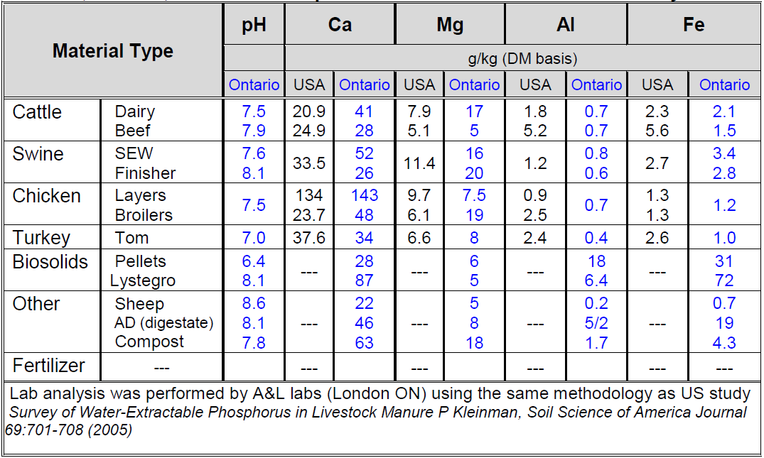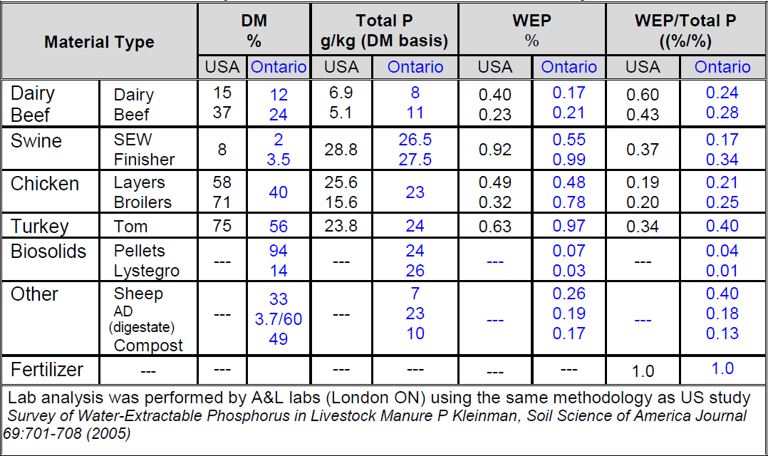 Sample data was compared to the US study by P. Kleinman et al (Survey of Water-Extractable Phosphorus in Livestock Manure P Kleinman, Soil Science of America Journal 69:701-708 (2005)) The data was compared in hopes of verifying the P availability values used in PLUTO and better understanding what factors influence WEP. Finding trends based on composition, including total phosphorus, nitrogen, dry matter levels and micro nutrients levels – particularly calcium, iron, aluminum electrical conductivity (total salts) and organic matter would help to fine-tune additional sampling.