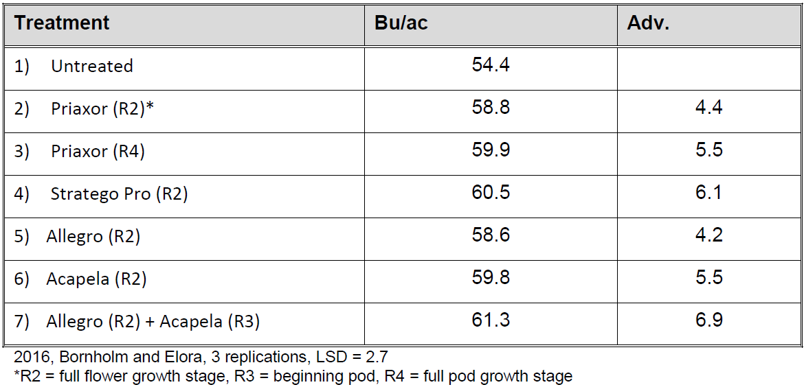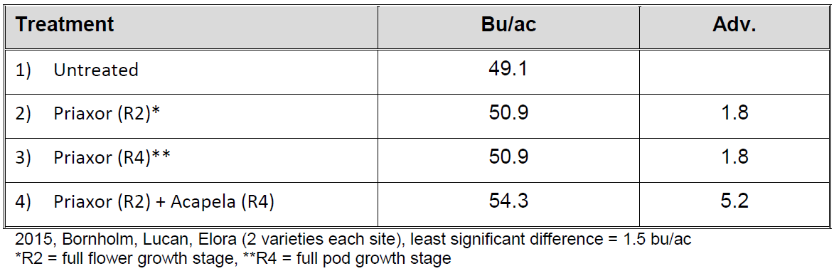 A positive yield response of 1.8 bu/ac was observed when Priaxor was applied at the R2 or R4 soybean growth stage. See Table 1. Two applications of a foliar fungicide more than doubled the yield response to 5.2 bu per acre.