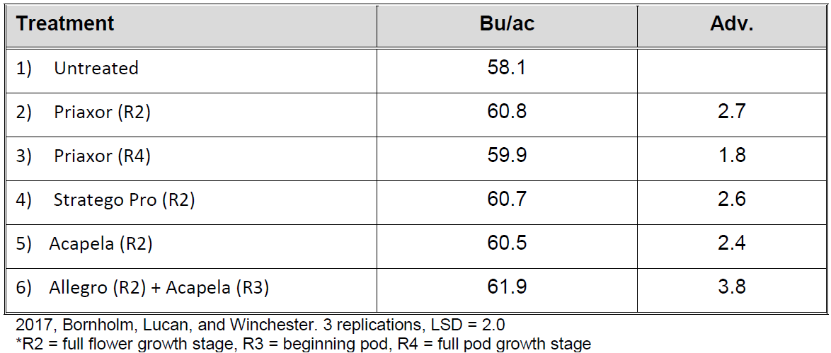 - Positive yield responses were observed when fungicides were applied at the R2 and R4 growth stages in 2015. There was no yield response to the R4 growth stage during the 2017 growing season. The yield response on average across the three years of this study to spraying Priaxor was 3.0 bu/ac when sprayed at the R2 growth stage.