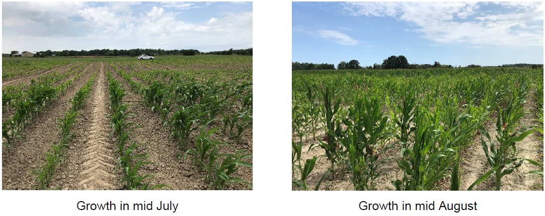 Compost was applied and incorporated followed by in-furrow application of biostimulant into the seed row, followed by planting corn. The season was wet and corn was not planted until June 9th. Weed control included several passes of inter-row cultivation. Cover crop white clover was seeded between the corn rows with good growth by harvest. Variable growth due to wet areas across the field, between and within treatments resulted in the need for hand harvesting (October 29) in a portion of the field where growth was comparable across treatments. Combine harvest occurred a month later.