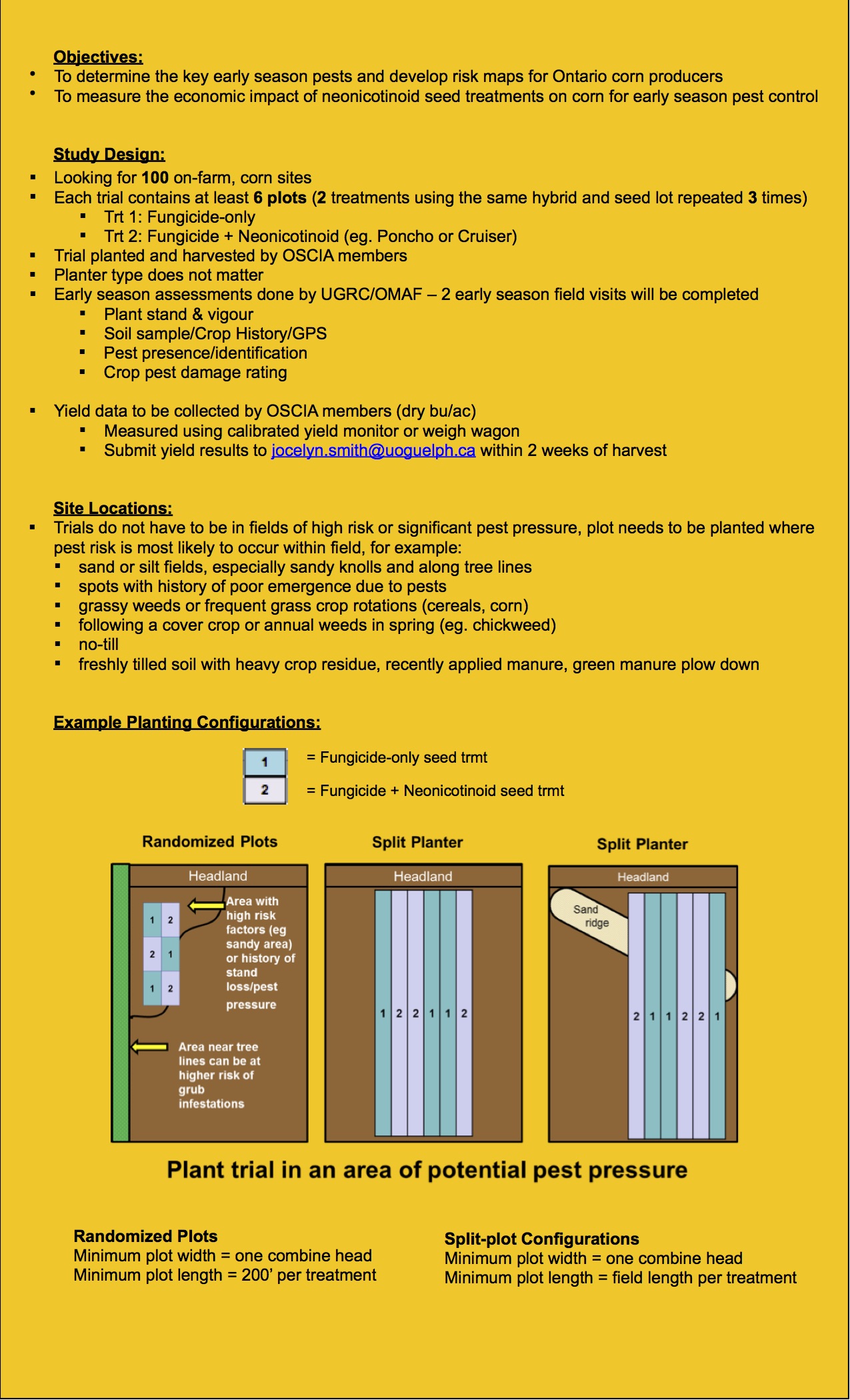 OSCIA, in cooperation with the University of Guelph (Ridgetown Campus) is looking for farm cooperators across Ontario willing to plant field-scale corn or soybean comparisons of neonicotinoid (e.g. Poncho, Cruiser or Stress Shield) versus non-neonicotinoids.