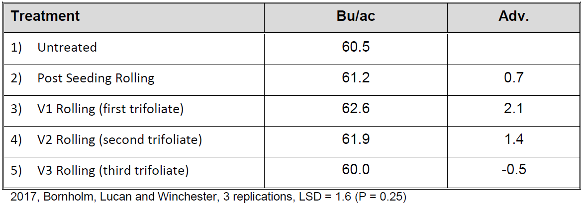 - For producers that typically roll fields immediately after seeding this study provides strong evidence that no yield reductions occur if rolling is conducted at the first or second trifoliate leaf stage.