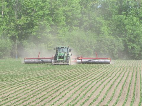 Land rolling helps conserve moisture and prepares the field for harvest. Rolling helps level the soil and pushes rocks into the ground, improving combine efficiency. Some producers roll immediately after planting, while others wait until the soybeans have emerged. Rolling immediately after planting provides improved seed-to-soil contact and reduces the likelihood of plant injury. However, it also increases the chance of soil crusting, which hinders soybean emergence. Soybean fields that are not rolled after the drill may emerge more quickly. If heavy rainfall occurs after seeding, rolled fields are more prone to crusting. To avoid these challenges some growers choose to roll their fields after beans have emerged. There have also been reports that early season stress from post emergent rolling may shorten internodes, stimulate early season growth, increase pod number, and thereby increase yields.