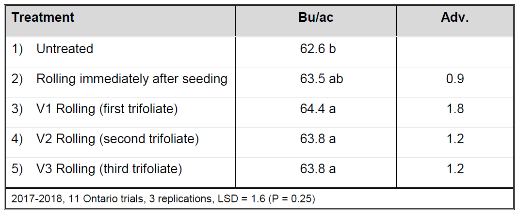 2) For producers that typically roll fields immediately after seeding this study provides strong evidence that no yield reductions occur if rolling is delayed and conducted at the first or second trifoliate leaf stage.2) For producers that typically roll fields immediately after seeding this study provides strong evidence that no yield reductions occur if rolling is delayed and conducted at the first or second trifoliate leaf stage.
