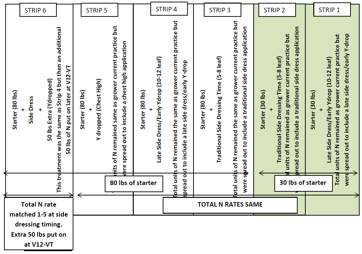 Treatment 6 – Growers current N rate – included a starter (80 lbs -Minimum) + Side dress application (5-8 leaf) – Total N rates matched treatment 1,2,3,5 at the end of the side dress application. An additional 50 lbs of N was applied at V12-VT.