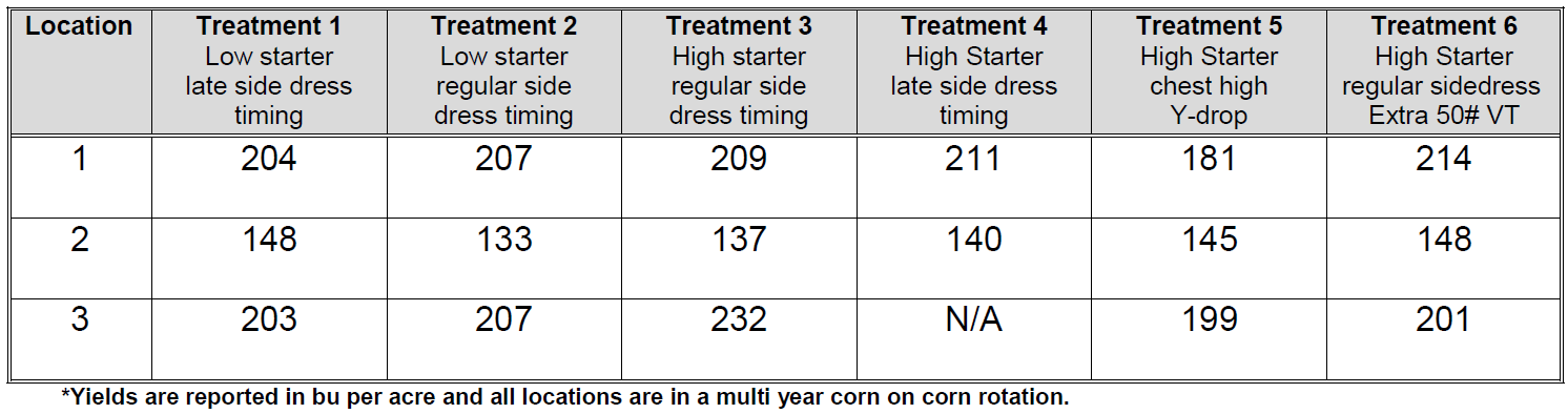 - Where a higher amount of dry starter was used at planting and side dressed at the traditional 5-8 leaf timing, corn yields tended to be higher.
