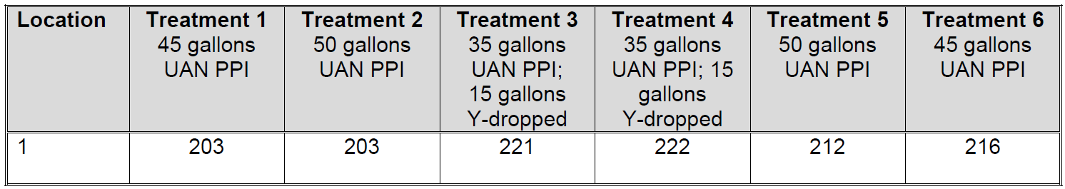- There was no significant difference between 45 or 50 gallons of UAN applied pre plant.