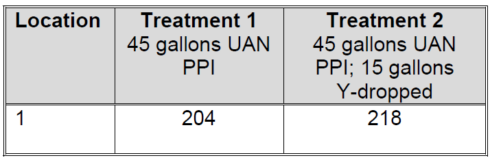 - The addition of 15 gallons of N (45 lbs) applied over the standard rate of N increased yields by 14 bu in the second site.