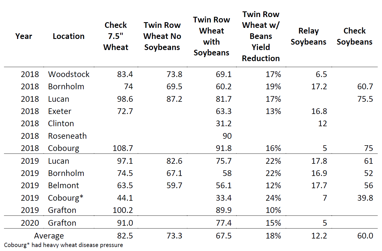 The yield results from this project varied significantly over the 3 years that it ran and are shown in Table 1. There were some exceptional yields and some poor yields. There were also several sites with incomplete data. For the final analyses only the sites with full data will be used, except the Cobourg 2019 site which had significant disease pressure in the wheat creating an outlier to the data set. It can be seen in Table 1 how consistent the wheat yield drag was when growing a relay soybean crop. It can also be seen that the relay soybean yields were extremely lower than the check plots.