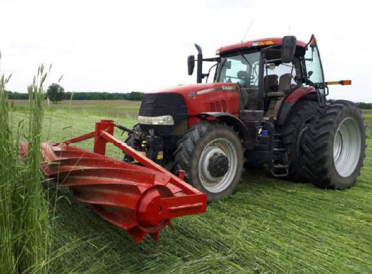 Figure 1. A front-mounted roller crimper being used to terminate cereal rye at anthesis in Ontario, June 2019