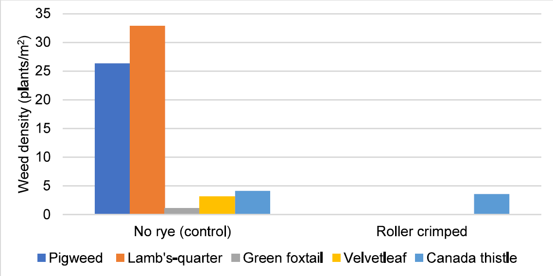 Weed density counts were made at two sites in the 2020 season in June. At the Drayton-2020 site, the presence of crimped rye drastically reduced the density of the predominant species, pigweed and lamb’s-quarters (Figure 12). Mechanical weed control by tillage effectively managed weeds on the no-rye control, while weed suppression by the rye mulch also proved effective throughout the season. By harvest, the crimped rye strips had some patches of Canada thistle coming through but were quite a bit cleaner than the no rye control (Figure 13).