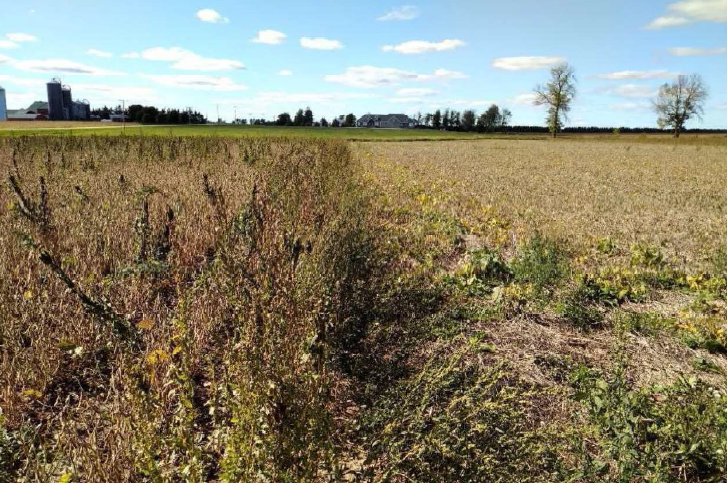 Figure 13. Presence of weeds by season’s end at the Drayton-2020 site. Fewer weeds in the organic no-till rye strips (right) made for easier combining than in the no-rye control strips (left).