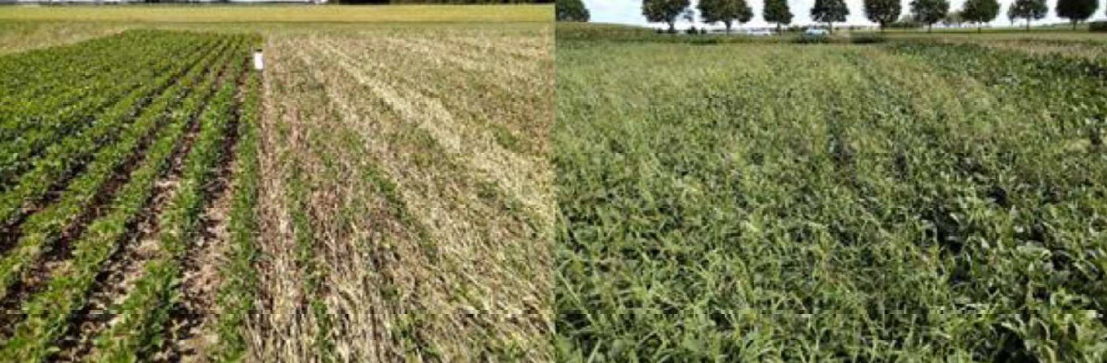 Figure 15. A comparison of a no-rye control vs. a roller crimped treatment at the Elora-2020 site on July 15th (left). The photo on the right shows the roller crimped treatment on September 3rd.