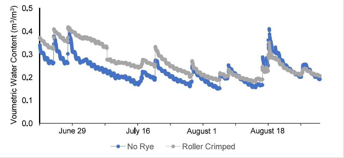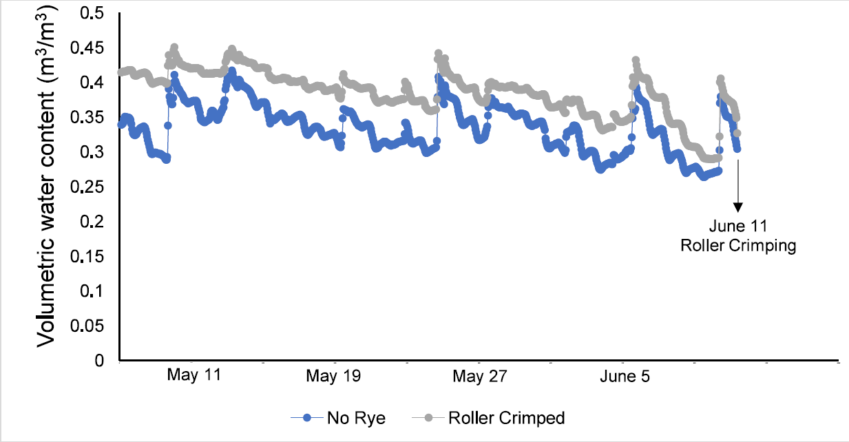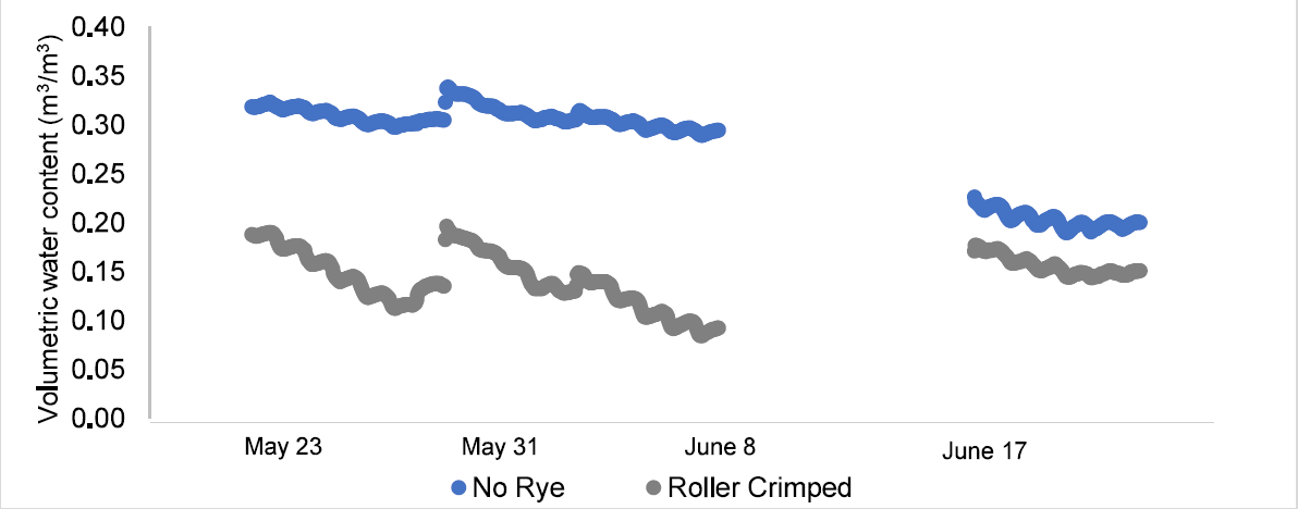 The difference in soil moisture was likely due to reduced evaporation from the soil underneath the rye during the wet spring of 2019. As the rye grew rapidly and headed out, however, it began transpiring much larger amounts of water, which helped dry out the soil.