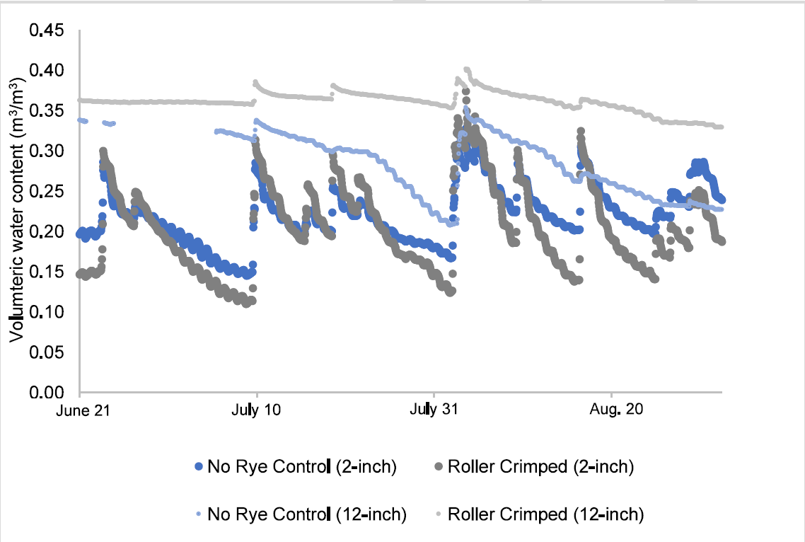 Sensors at 12-inch depth showed the reverse: the roller crimped treatment had consistently higher soil moisture than the no rye control. It’s hypothesized that this is because the soybeans in the control treatment grew much more rapidly and developed a deeper root system that was able to access moisture in the subsoil.