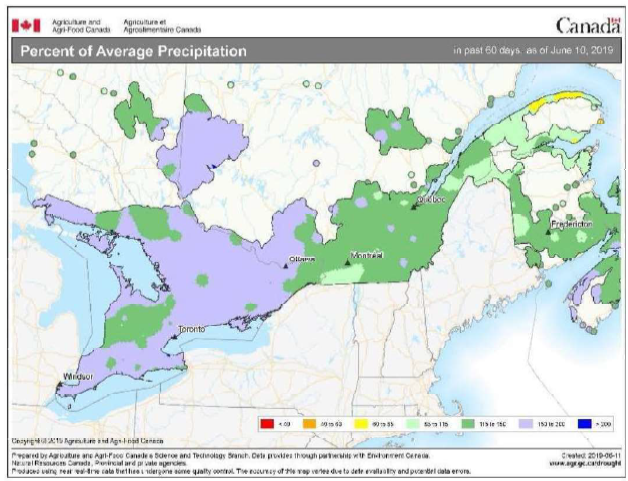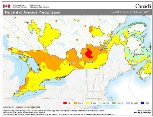 Figure 3. Percent of average precipitation in the 60 days leading up to June 10 (2019), June 8 (2020) and June 7 (2021) for central Canada (Agriculture and Agri-Food Canada).