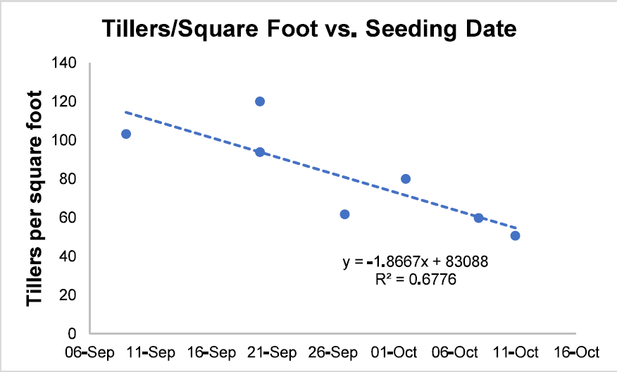 Figure 6. Average tillers per square foot, as measured in April 2020, vs. rye seeding date for seven 2020 trial sites.