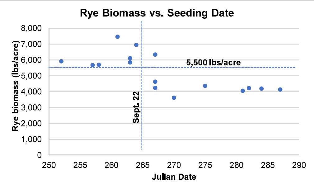 Earlier seeded rye generally had a higher tiller count (Figure 6) and greater biomass (Figure 7). Based on 16-site years, seeding before September 22nd was critical for achieving greater than S,S00 lbs/acre dry; sites seeded after that date generally had low biomass.