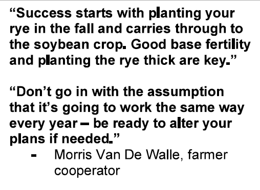 - If rye stand is poor or precipitation is below normal in May, strongly consider an alternative to crimping and seeding soybeans no-till, e.g. tilling rye under or cutting rye for feed and planting tillage-based soybeans