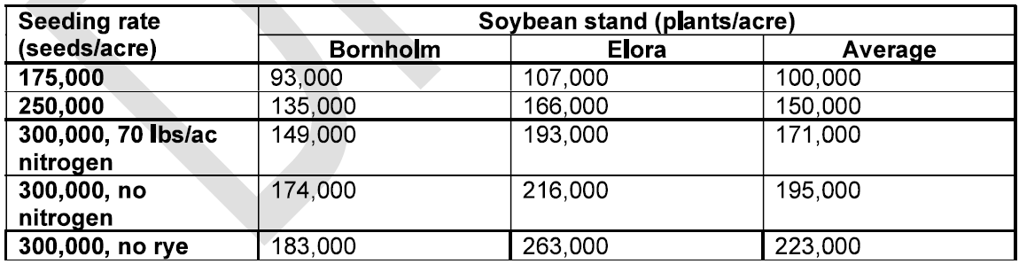 Applying 70 lbs/ac nitrogen at rye green-up resulted in a thicker stand of crimped rye, which slightly reduced the soybean stands at both sites. Plant stands were greater at every seeding rate at Elora, due likely to higher soil moisture at planting.