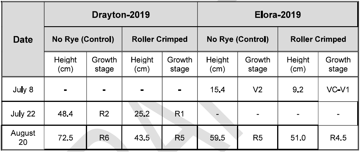 Table 5. Average soybean height and growth stage at various points throughout the season at the Drayton and Elora sites in 2019.