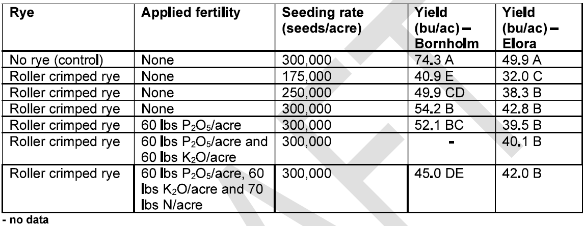Added P, P and Kor N, P and K did not affect yield at Elora. At Bomholm, however, addition of nitrogen to rye in April resulted in a 7.1 bu/ac yield reduction relative to the P only treatment. The added nitrogen resulted in greater rye biomass and reduced soybean stands at both Bornholm and Elora. The lower stand at Bornholm was likely in part responsible for reduced yield in the treatment with added nitrogen.