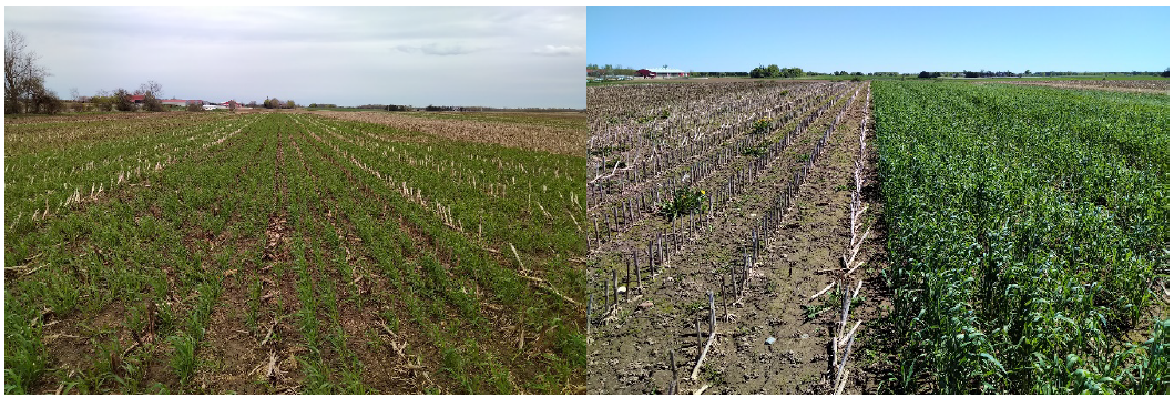 Figure 1. Cereal rye strips at the Kenilworth 2019 site shortly after early termination (May 18; left) and just prior to “planting green” (June 7; right)
