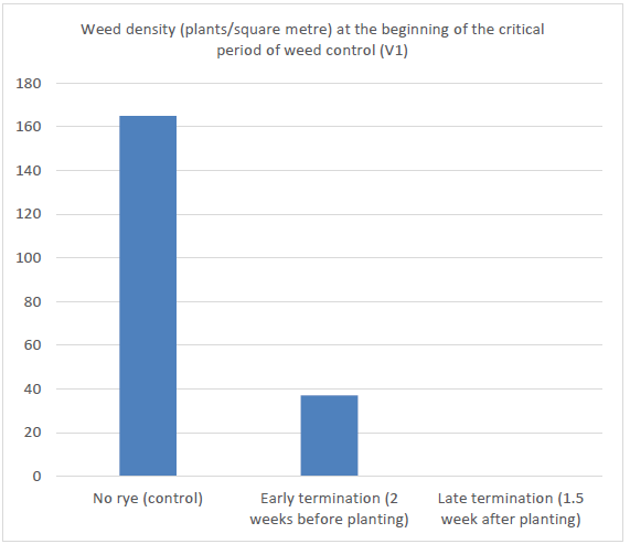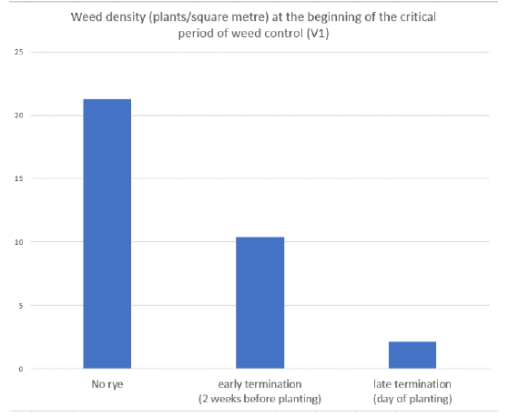 - Delaying termination of rye resulted in lower weed abundance in both 2019 and 2020. Late-terminated rye can be a tool to assist other forms of weed control.