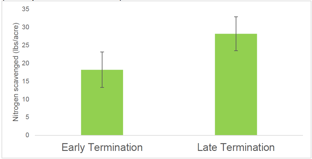 Delayed termination of rye resulted in slightly reduced soil nitrate levels at the time of planting. Across 14 site-years, early termination strips averaged 11.0 ppm (min. 8.4 ppm, max. 18.8 ppm), while plant green strips had an average concentration of 8.3 ppm (min. 6.1 ppm, max. 13.9 ppm). Extra nitrogen uptake translated into differences in the amount of nitrogen scavenged in aboveground rye biomass. Across the same sites, cereal rye took up an average of 28.1 lbs/acre when terminated late and only 18.1 lbs/acre when killed early (Figure 2).