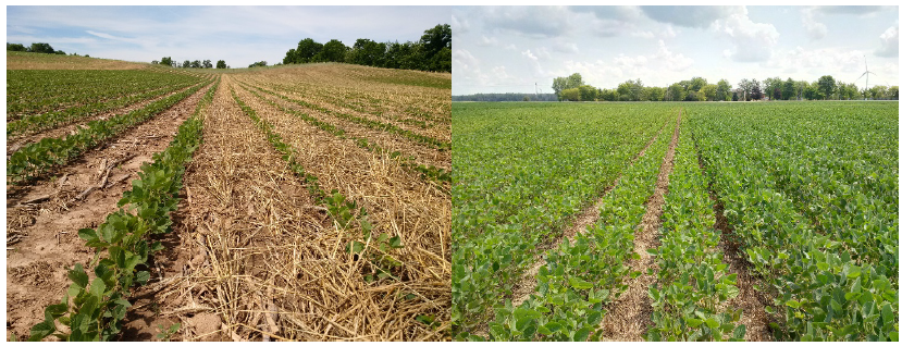 Figure 3. Soybeans at the Brantford 2018 site on June 26 (left) and the Lambton 2018 site on July 31 (right), where soybeans planted into early terminated rye were taller, greener, and one growth stage ahead.