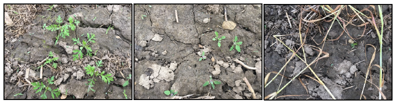 Figure 7. Weed abundance at the Elora 2019 site in the “no cereal rye” control (left), the early termination plot (centre) and the late termination plot (right).