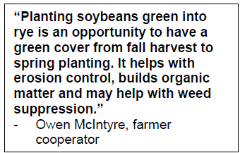 - Soybean stand reduction can result from planting green into rye – consider slightly higher soybean seeding rates when planting into a thick cover crop