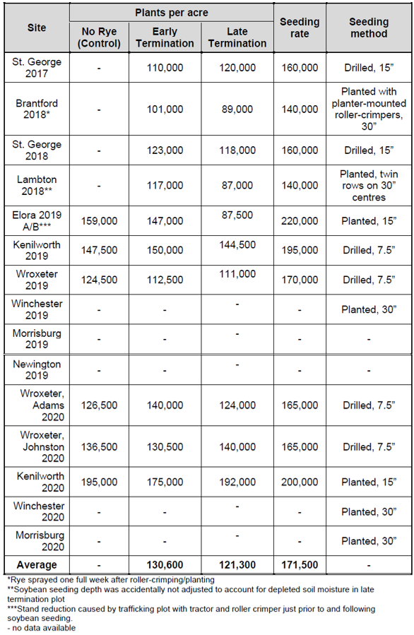 No tillage was performed at any of the sites except for St. George 2017, where minimum tillage was done on grain corn residue in fall of 2016, and Elora 2019, where a culti-packer was used to prior to rye seeding. A combination of herbicide (glyphosate)and roller crimper was used to terminate rye at the Elora 2019 site. Herbicides were applied as appropriate for weed control at all sites, except at the Elora 2019 A and B sites, which only received a single herbicide application in the late termination treatment.