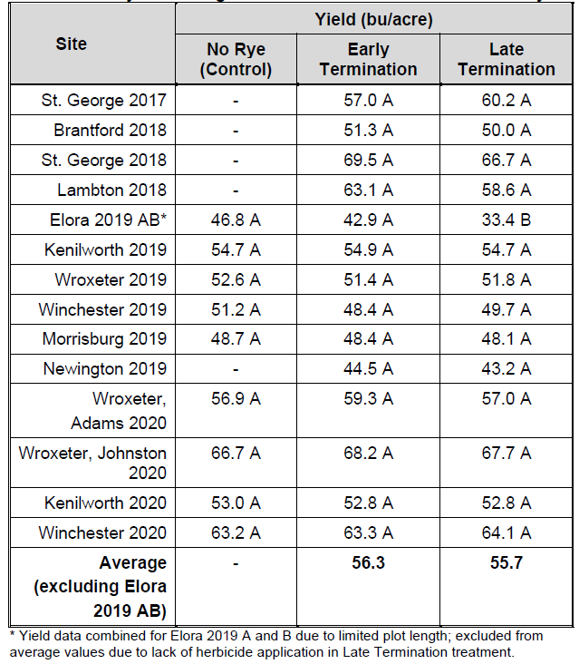 At the Morrisburg 2020 site, termination after soybean planting was evaluated. Rye was terminated approximately one week and 2.5 weeks after soybean planting (which occurred on May 14th). The no-rye control treatment only had one replicate. Yield data is presented separately from the other sites.