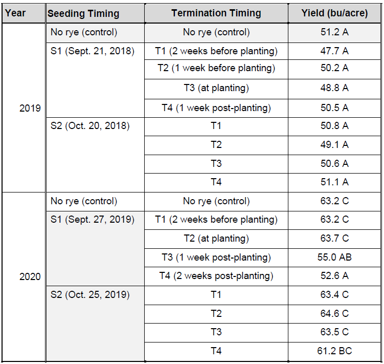 - Planting soybeans green into rye did not negatively impact yield relative to early termination; however, delaying termination until two weeks after planting did hurt yields in 2020