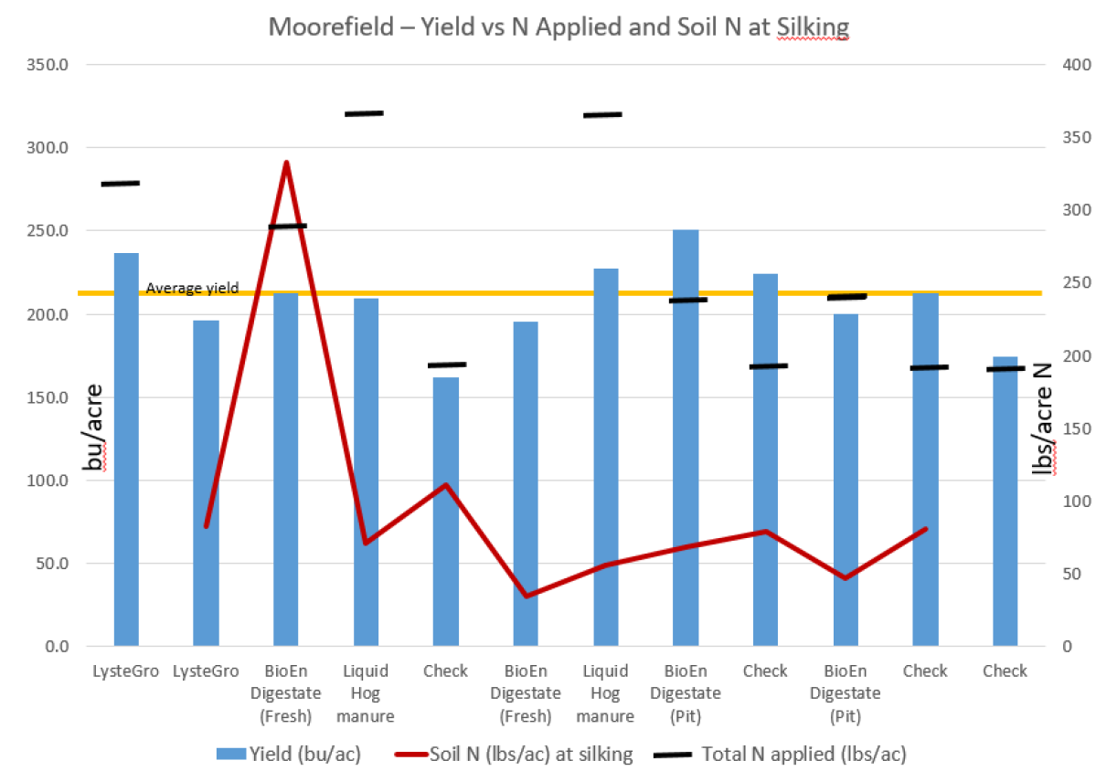 Figure 2a, the Moorefield site includes application at side-dress of Lystegro, finisher hog manure and anaerobic digestate from BioEn, all at 3,000 gallons/acre. The BioEn from the pit had been in storage for a period of months and had lost some of the nitrogen content compared to the material that was fresh from the plant. The nitrogen status in this field is high and there does not appear to be a direct response between the nitrogen that was available for the crop to yield as shown by the treatments with near average yields that had less nitrogen applied. The soil nitrogen status as sampling also indicated that over 50 lbs was adequate for the crop. Stalk nitrate results were highest where the soil nitogen was highest and plant tissue tests indicated adequate nutrients available for growth.