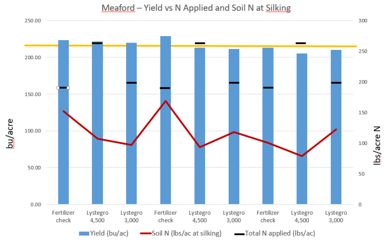 The Meaford site shows a yield response to the Lystegro. The 3,000 gal/ac application rate appears adequate for best yield results. At this site, the additional nitrogen applied from the higher rate did not appear to increase yield. Stalk nitrate samples from all the treatments were high at this site, but well over 2,000 ppm for the 4,500 gal/ac application rate. The soil nitrogen results in this field are higher than expected, even for the fertilizer check plots and the plant tissue results were also within the ideal range for growth. A stalk nitrate test of over 2,000 ppm is an indication that more nitrogen was applied than required for the crop. In this site a lower rate of nitrogen might have resulted in more economic yield.