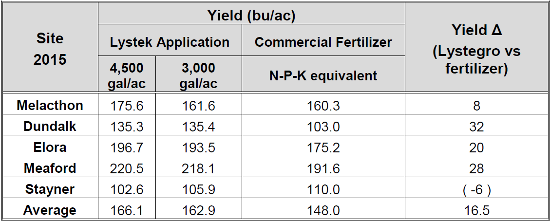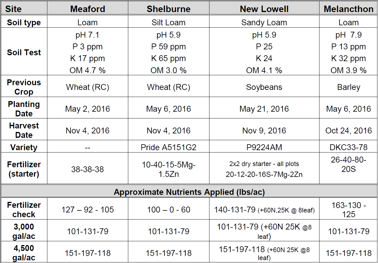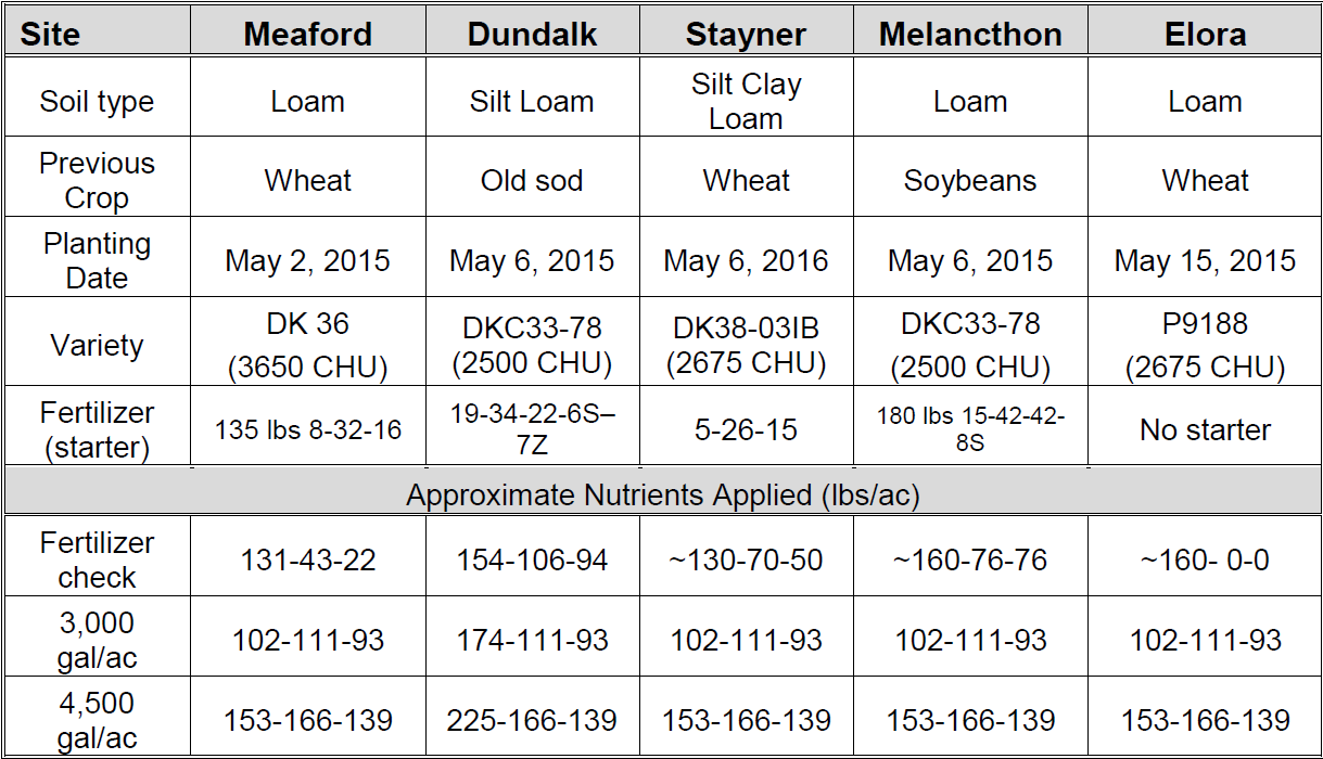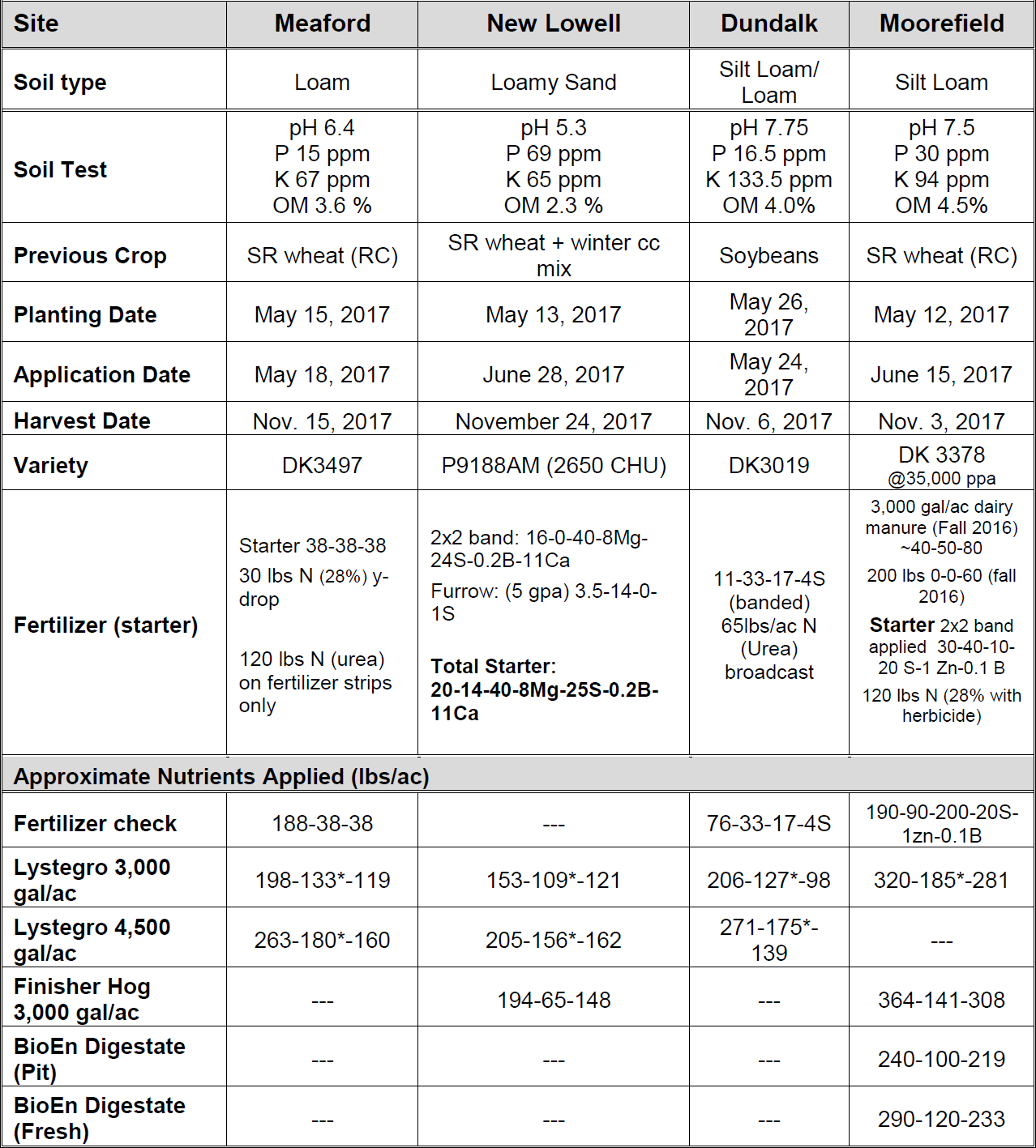 The study was carried out at 5 locations in 2015; 4 locations in 2016 with the layout shown in Table 1. In 2017, 4 sites were included in the study with all sites including Lystegro in the treatments and two sites including hog finisher manure. One site compared two rates of Lystegro with hog manure in an in-crop side-dress application. The individual site information for each year is shown in table 4 (2015) Table 5 (2016) and Table 6 (2017).